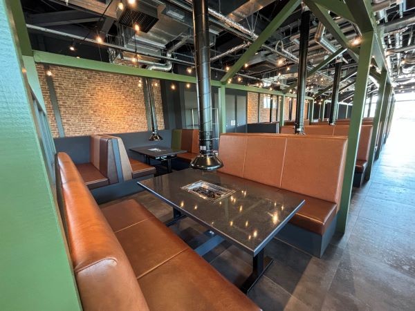 2階のBBQスペースは完全屋内なので、天候を気にせず快適にモダンで都会的なBBQを楽しめます。県内唯一のテーブル設置型ガスグリル使用の